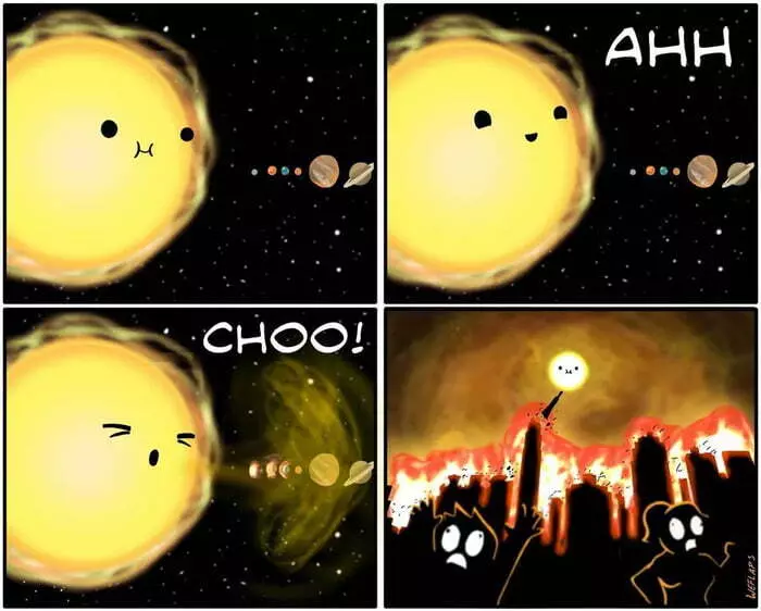 Вы наверняка слышали про циклы солнечной активности (тут сложно не услышать, в разных пабликах сразу же пишут, когда нас ждёт магнитная буря). Наша звезда — это не стабильное светило, оно работает с циклом примерно в 11 лет (ну это один из циклов). То Солнце спокойно (солнечный минимум), то начинает покрываться пятнами и швырять в нас вспышками (солнечный максимум).