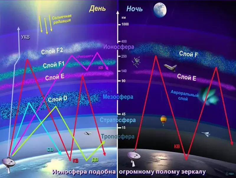 Благодаря ему мы можем слушать коротковолновое радио за горизонтом (волны отскакивают от неба и возвращаются на землю), но из-за него же мы понятия не имеем, что там творится снаружи, в ближнем космосе. Ионосфера просто глушит или отражает сигналы, идущие извне, если они не на тех частотах.