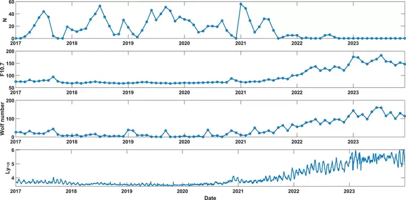 Так вот, до 2022 года Солнце было относительно тихим. А потом начался разгон к пику активности, в котором мы сейчас, кстати, и живём. Количество пятен на Солнце выросло, поток ультрафиолета и радиоизлучения от звезды (особенно на длине волны 10,7 см, это важный маркер) резко скакнул вверх.