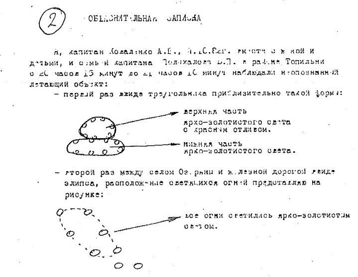 Очевидцы описывали разнообразные аномалии. Капитан Полихаев доложил о наблюдении двух ярких объектов, напоминающих «гирлянду» из шести-восьми золотистых огней, которые демонстрировали скоординированное поведение. Капитан Коваленко вместе с семьями других военнослужащих наблюдал треугольный объект с золотисто-красными огнями, который на большой скорости совершил мгновенную остановку в воздухе. Подполковник Баланей описывал группу огней, меняющую конфигурацию от эллипса к прямой линии, после чего объекты словно «растворились» в небе. Параллельно с визуальными контактами, лейтенант Кобулянский и его спутники зафиксировали сильнейшие помехи на всех диапазонах автомобильной радиосвязи.