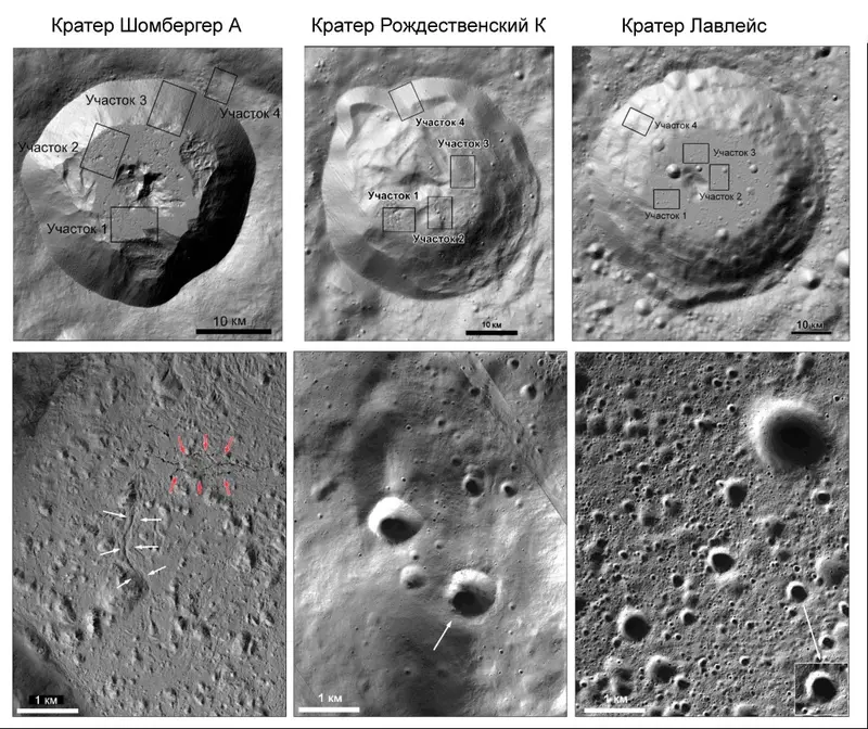 В верхнем ряду изображения изучавшихся кратеров, полученные методом отмывки по данным высотомера LOLA с участками исследований. В нижнем ряду ShadowCam изображения участков исследований на днищах кратеров. Слева изображение участка исследований 2 на днище кратера Шомбергер А. Белые стрелки указывают на русло застывшего ударного расплава, красные стрелки на трещины. В центре изображение участка исследований 2 на днище кратера Рождественский К; стрелка указывает на кратер с «лопастным» валом. Справа изображение участка исследований 2 на днище кратера Лавлейс; в правом нижнем углу увеличенное изображение кратера с «лопастным» валомИсточник: Новости РАН
