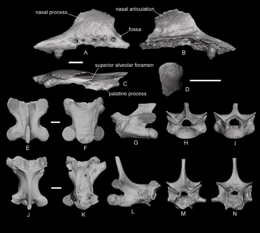 Верхнечелюстная кость (A—C), изолированный зуб (D) и позвонки (E—N) желтопузика Pseudopus apodus (Pallas, 1775) из нижнего плейстоцена пещеры Таврида, Крым. Масштабная линейка 2 ммИсточник: Новости РАН
