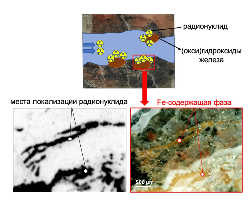 Ученые моделировали условия подземного хранилища, используя раствор-имитатор подземной воды и контакт с трещиноватыми гнейсовыми породами. В этих условиях железо из корродирующих контейнеров постепенно переходило в раствор и затем выпадало в виде тонкодисперсных оксидов и гидроксидов. Такие вторичные фазы обладают развитой поверхностью и многочисленными активными центрами. Именно на этих фазах актиниды концентрируются значительно больше, чем на «первичных» минералах породы, окружающей негерметичный контейнер.