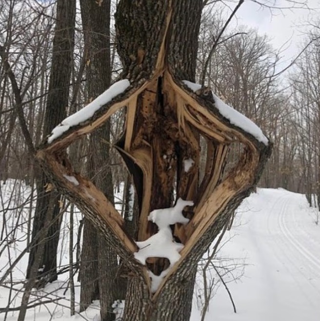 Речь идёт о явлении, известном как морозобойное растрескивание или «ледяной взрыв». Когда температура резко падает до экстремально низких значений, сок и влага внутри ствола замерзают почти мгновенно. Как и вода, превращаясь в лёд, они расширяются, создавая колоссальное внутреннее давление. Кора и древесина не выдерживают, и дерево лопается, часто с резким, громким хлопком. Внешне это выглядит как внезапное расщепление ствола, иногда сопровождающееся облаком ледяной пыли и щепы.