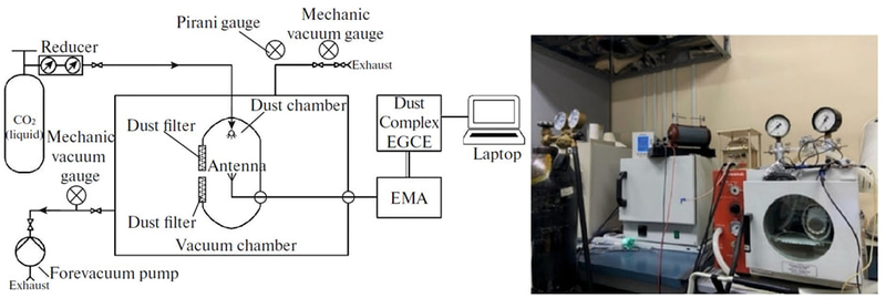 Экспериментальная установка для моделирования электрических явлений в атмосфере Марса. Пылевая камера интегрирована в вакуумную систему, которая откачивается и затем заполняется углекислым газом при низком давлении. Этот стенд позволяет изучать генерацию электромагнитных сигналов в условиях, максимально приближенных к марсианским