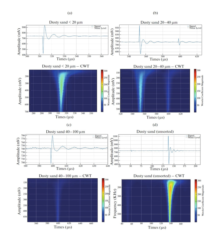 Сигналы пыли разного размера. Каждая панель показывает электромагнитный сигнал от разряда (вверху) и его спектральный анализ во времени (цветное изображение внизу), где цвет отражает интенсивность сигнала на определенной частоте. Видно, как меняется структура сигнала: от мощного одиночного всплеска для мелких частиц (a, <20 мкм) до сложной, двухэтапной структуры для несортированной смеси песка (d)