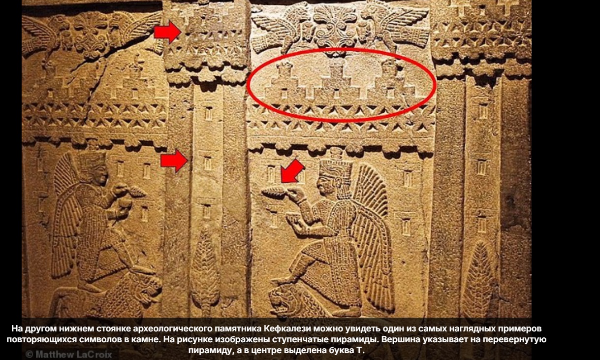 Важным артефактом для исследователя стал базальтовый рельеф размером около 1,2 на 1,2 метра, найденный на близлежащем месте Кефкалеси. На нём вырезаны сложные иконографические элементы: Т-образные знаки, ступенчатая пирамида с тремя входами и изображение льва. Лакруа утверждает, что эта комбинация символов не случайна и является ключом к пониманию более широкой системы. Лев, по его интерпретации, выступает в роли стража или защитника этого кода.