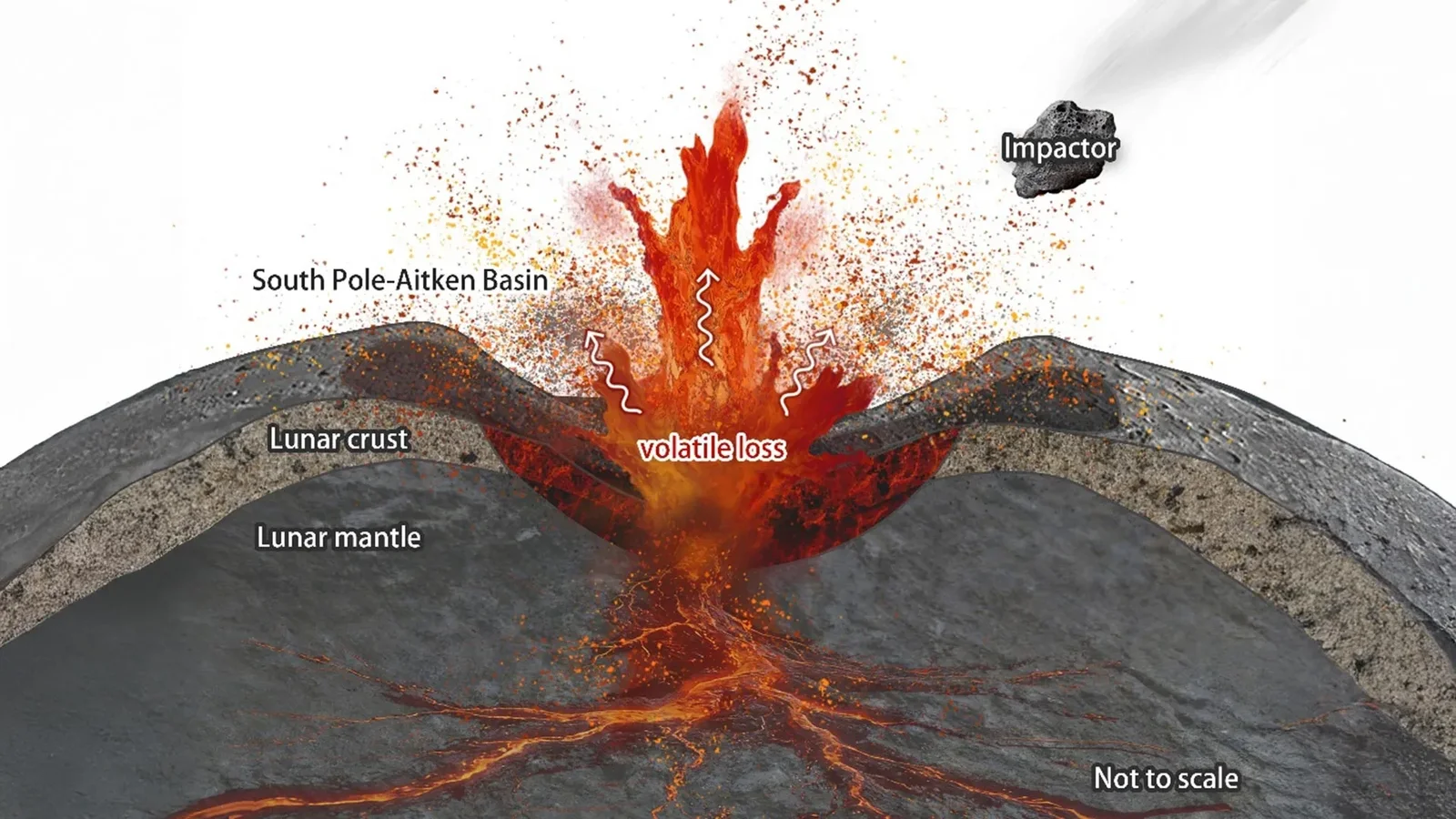 Таким образом, единственным вероятным объяснением оказался мощный удар, произошедший миллиарды лет назад. Он привел к формированию южнополярного бассейна Эйткена. Анализ показал, что во время этого катаклизма значительная доля легких изотопов калия испарилась, оставив преобладающими тяжелые изотопы.