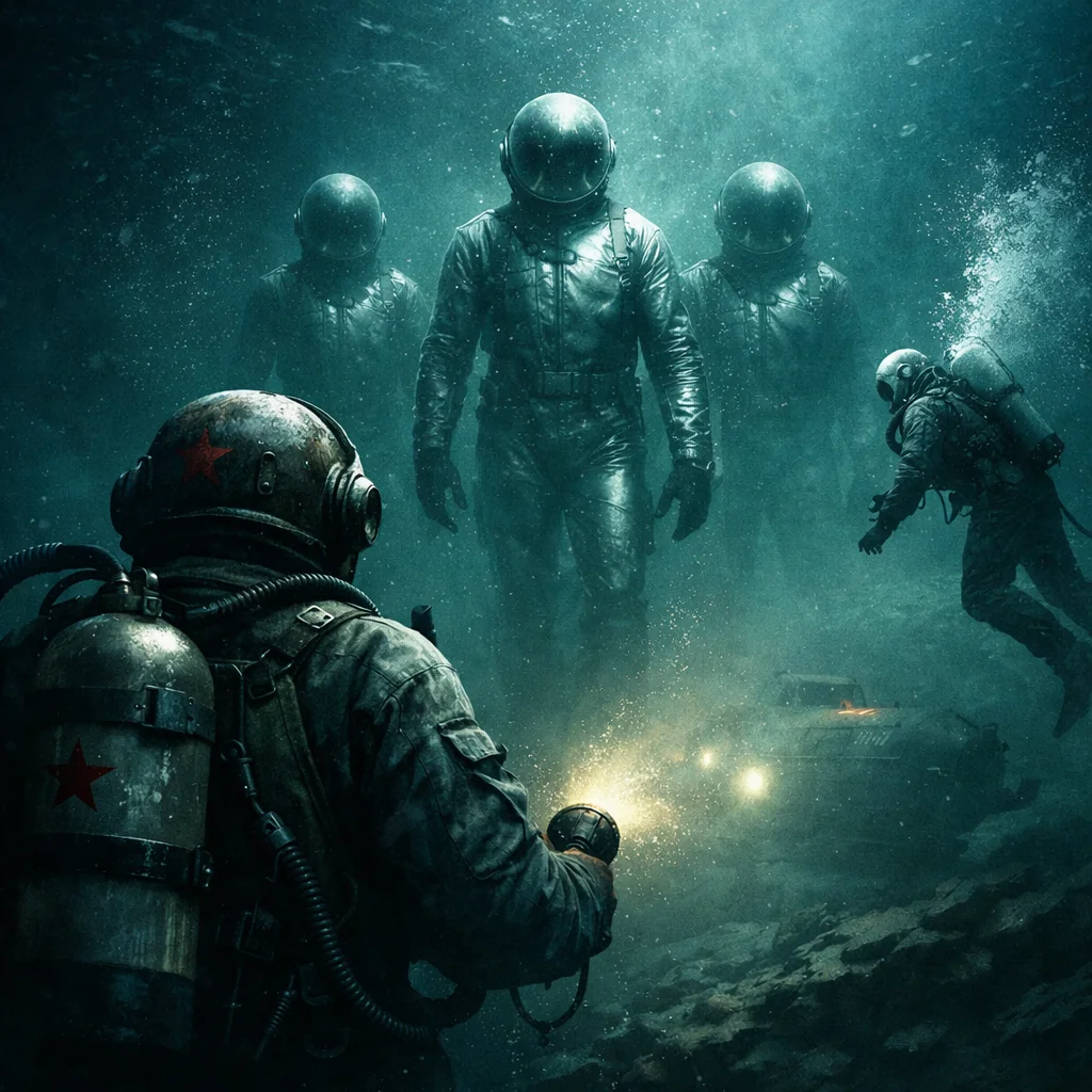 В ходе учений на Байкале советские аквалангисты на глубине 50 метров обнаружили неизвестных пловцов. Это были гуманоидные существа огромного роста — почти три метра. На них были обтягивающие серебристые костюмы, несмотря на ледяную воду. Самое поразительное — у них не было аквалангов или иного дыхательного оборудования, лишь сферические шлемы, скрывавшие головы .