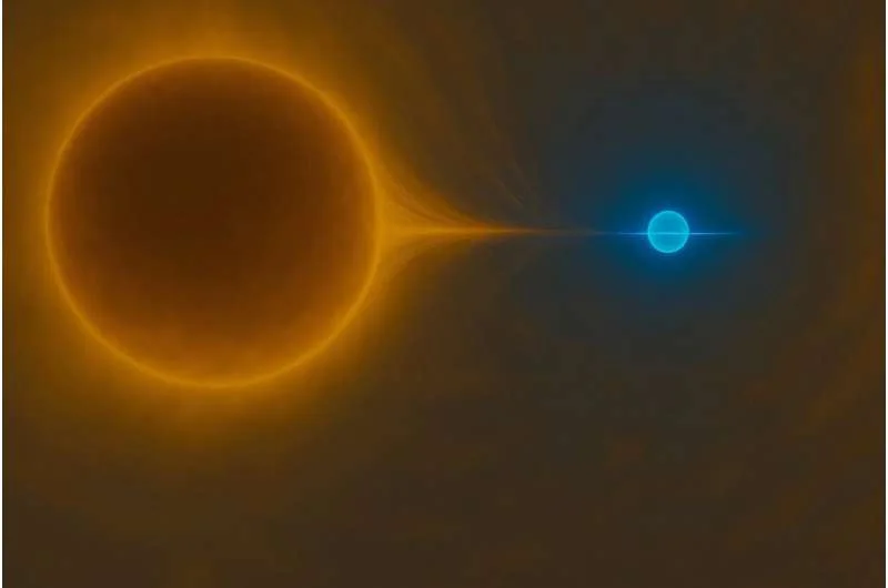 Новейшая концепция поведения красного сверхгиганта WOH G64. Непорядок происходит в результате происков горячего голубого компаньона на орбите с высоким эксцентриситетом.Источник: https://phys.org/