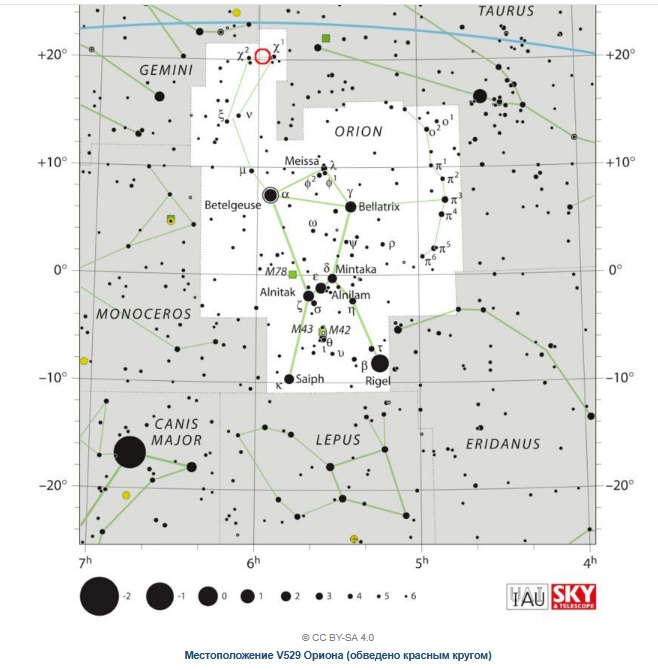 Иоганн Гевелий наблюдал новую звезду в 1679 году, которая до сих пор остается загадкой и обычно считается, что это была нова. Это наблюдение получило название V529 Orionis. Расположение — красный круг на этом изображении, а синяя линия — плоскость эклиптики Солнечной системы.
