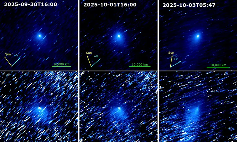 Наблюдения проводились с помощью камеры HiRIC, установленной на орбитале. Аппарат снял серию изображений в три разных периода с 30 сентября по 3 октября 2025 года. Снимки показали заметные изменения в структуре кометной комы и хвоста.