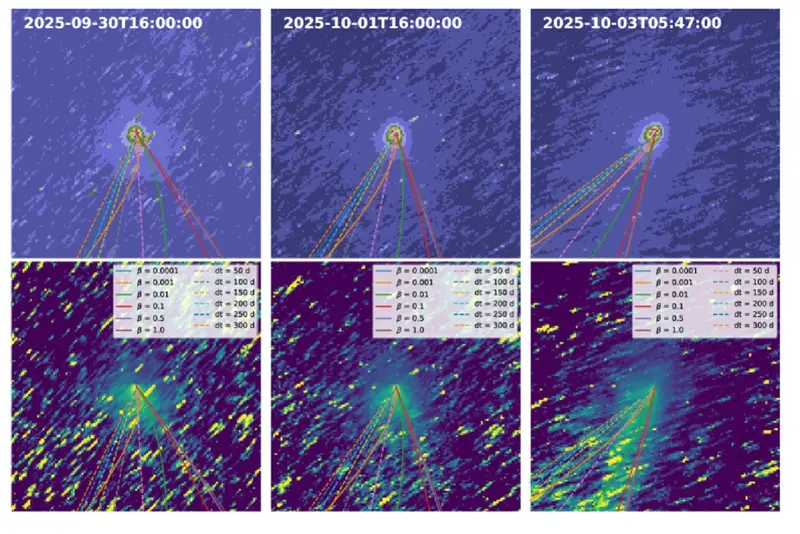 Наблюдения 3I/ATLAS с разных точек — с Земли, космических телескопов и теперь с орбиты Марса — позволяют реконструировать трехмерную структуру ее пылевого хвоста.