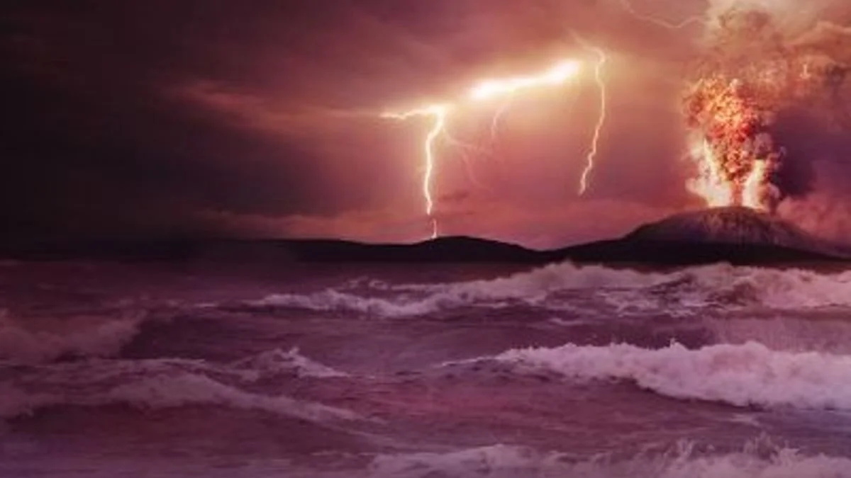 Концепт-изображение ранней Земли с пенящимся морем и бурным извержением вулкана, в которые били молнии. Предполагаемые ранее условия для возникновения жизни на Земле. Изображение: NASA