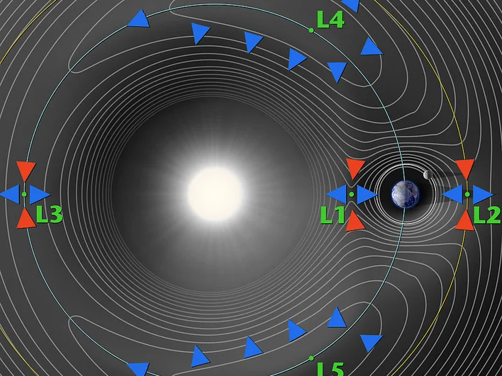 Расположение точек Лагранжа в системе Солнце-ЗемляИсточник: https://commons.wikimedia.org/
