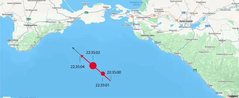 Ученые подчеркнули, что болид двигался в северо-западном направлении в сторону Крымского полуострова. Его можно было наблюдать на протяжении примерно 4 секунд. За это время метеорит прошел от 100 до 200 км, что полностью исключает техногенное происхождение тела. «На 1-й и 2-й секундах движения наблюдались два эпизода разрушения тела на фрагменты. Предположительно, еще около 2–3 секунд после прекращения яркого свечения мелкие фрагменты могли двигаться по инерции, преодолев дополнительно расстояние от 50 до 100 км, после чего выпали в акватории Черного моря», — сообщили в пресс-службе.