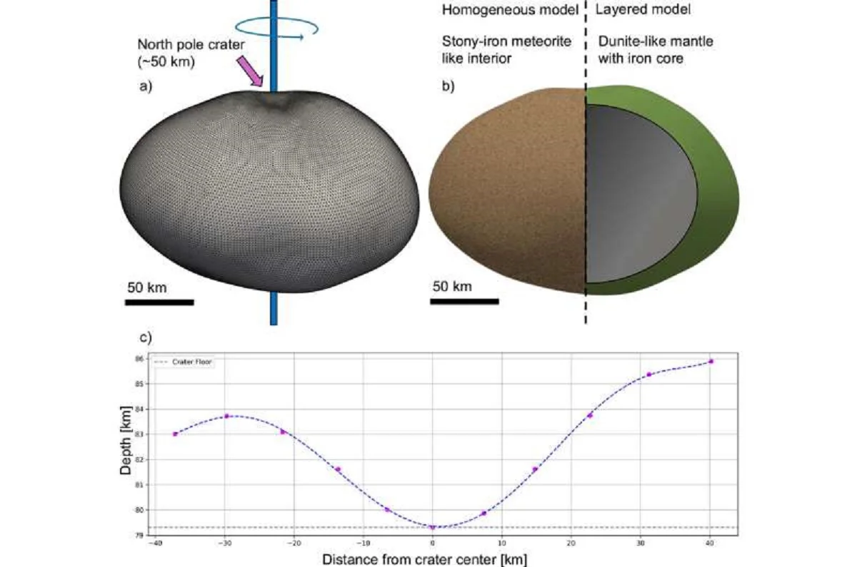 (a) Новейшая модель формы Психеи, разработанная Шепардом и соавторами (2021), с осью вращения, ориентированной вверх. (b) Два концевых элемента внутренней структуры Психеи (слева), состоящей из смеси металла и силиката, (справа), слоистой внутренней части с большим железным ядром, окруженным мантией. (с) Профиль поперечного сечения кратера NP, полученный путем моделирования формы. Диаметр - ≈50 км, глубина - ≈5,1 км. Фото: Журнал геофизических исследований: Планеты (2026). DOI: 10.1029/2025je009231Источник: https://phys.org/