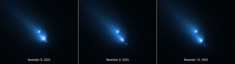 До фрагментации K1, вероятно, была крупнее средней кометы — около 8 километров в поперечнике. Исследователи полагают, что распад начался за восемь дней до того, как за ней начал наблюдать «Хаббл». Телескоп сделал три снимка с выдержкой 20 секунд — по одному 8, 9 и 10 ноября 2025 года. За время съемки ученые увидели, как один из меньших осколков тоже раскололся.