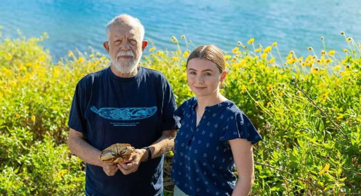 София Лекуона Манос (справа) - одна из нескольких студенток-исследователей, которые обнаружили нового хищника, откладывающего яйца, в лаборатории паразитолога Калифорнийского университета Арманда Куриса (слева), держащего желтого каменного краба. Автор: Мэтт Перко, Калифорнийский университет в Санта-Барбаре.Источник: https://phys.org/