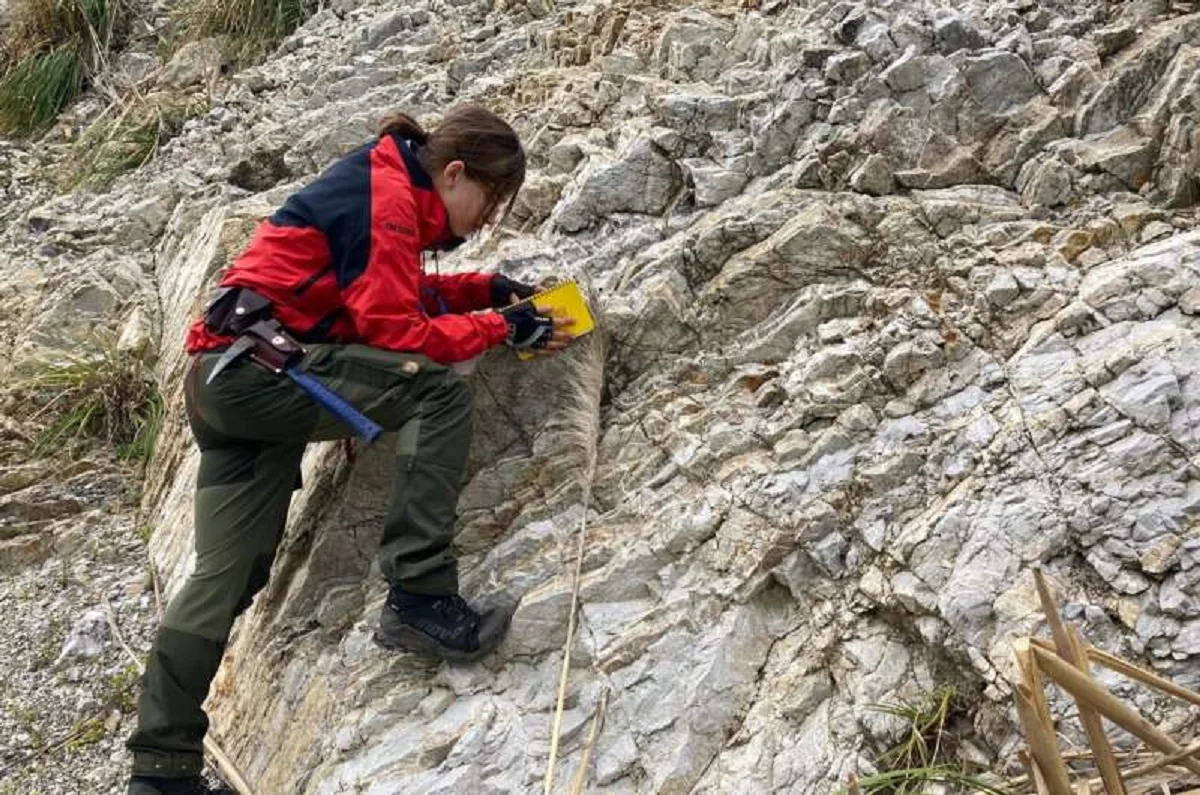 Автор исследования Стейси Эдмонсон исследует скальные обнажение в Калифорнии, которое похоже на горные породы, описанные в ее недавней статье в Proceedings of the National Academy of Sciences, но намного моложе их. Автор: Кай Тавил-Морсинк.Источник: https://phys.org/