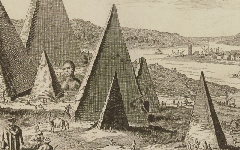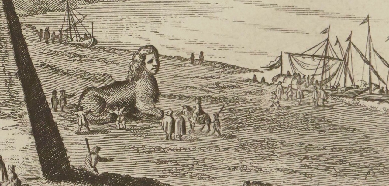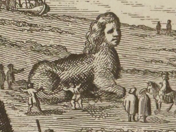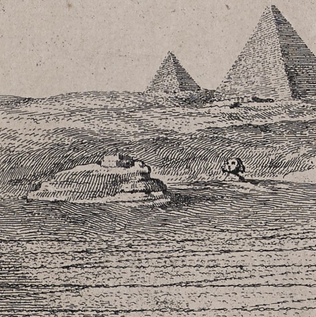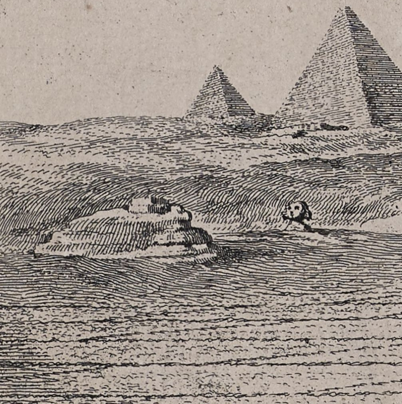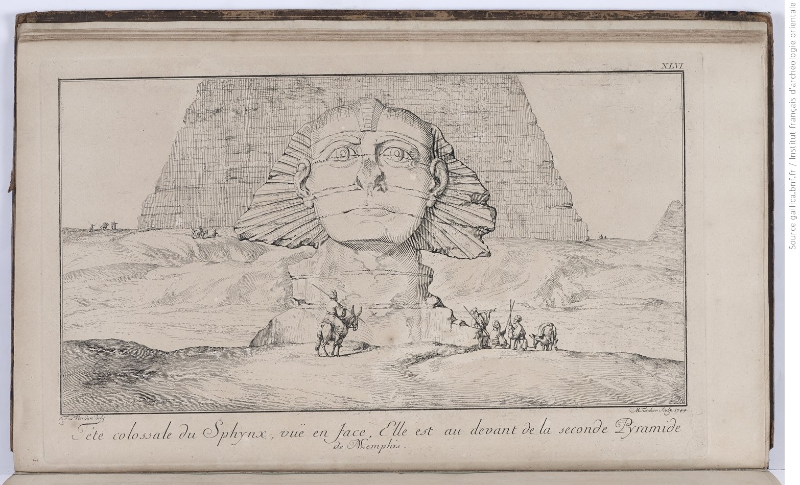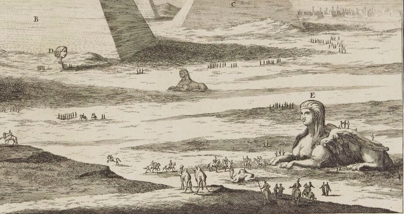 В 1757 году датский путешественник Фредерик Норден создаёт подробный план плато Гиза. На этом плане отчётливо видны две статуи. Та, что сегодня известна как Сфинкс, нарисована как бесформенная скала, торчащая из песка. Рядом с ней — голова статуи «эфиопской женщины», частично погружённая в песок. Именно эта голова на плане Нордена названа «Сфинксом». О скале, которую сегодня выдают за тело знаменитого монумента, в описаниях нет ни слова.