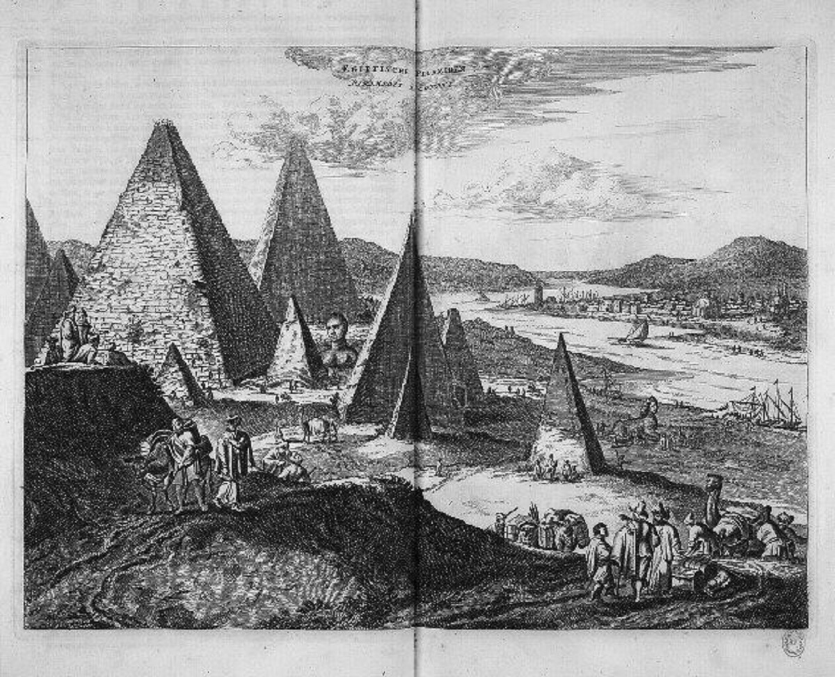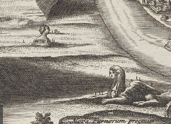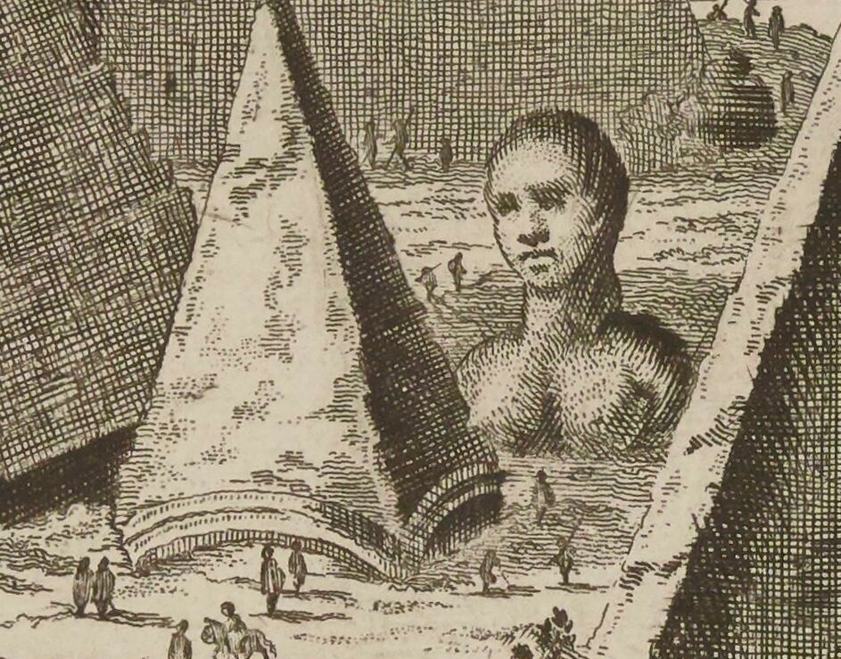 На гравюре из книги 1725 года, на карте 1720 года, в труде «Описание Африки» 1665 года — везде изображены два монумента. Один — классический Сфинкс с львиным телом и человеческой головой. Второй — статуя с головой женщины, обладающей явно выраженными негроидными чертами. В книге Джорджа Сэнди «Египетские пирамиды и Колосс» 1610 года говорится прямо: «Недалеко от них (от пирамид) стоит колосс... Эфиопская женщина, которую до сих пор обожали жители страны как верховное божество».