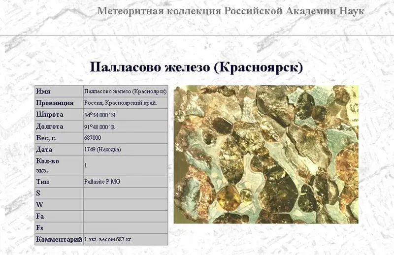 Карточка из метеоритной коллекции РАН. Скриншот: geo.web.ru/db/meteorites/