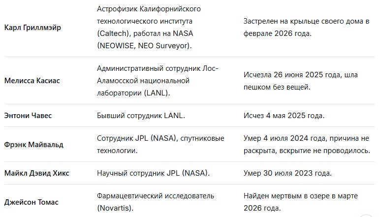 Официальные лица не подтверждают связи между этими случаями. В большинстве расследований говорится, что нет подтверждённых доказательств недобрых намерений. Но факты остаются фактами. Десять человек. Учёные и сотрудники лабораторий. Ядерные исследования, ракетные двигатели, спутниковые системы, гиперзвуковые технологии. Их смерти и исчезновения растянуты во времени и пространстве — от Калифорнии до Массачусетса, от 2023 до 2026 года. Но их объединяет одно: тишина. Тишина вокруг причин смерти. Тишина вокруг обстоятельств исчезновений. Тишина властей.