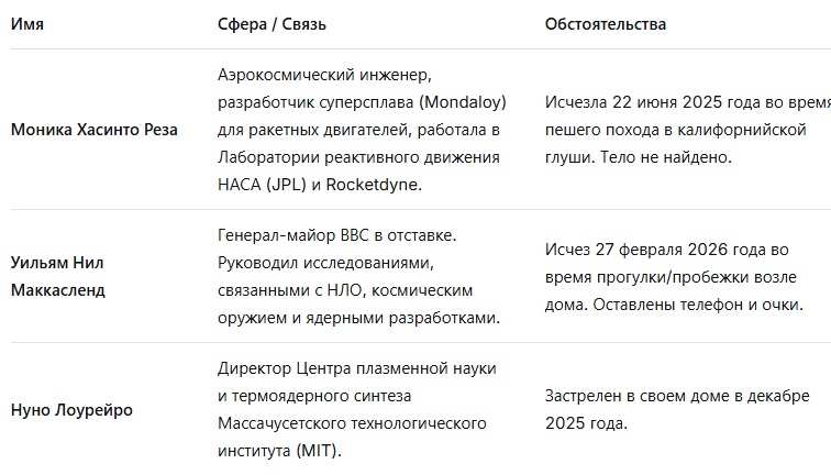 Пропавший ученый-ракетчик связан с критически важными оборонными технологиями. С середины 2025 года в США зафиксирована серия исчезновений и смертей учёных и военных, связанных с оборонными технологиями.