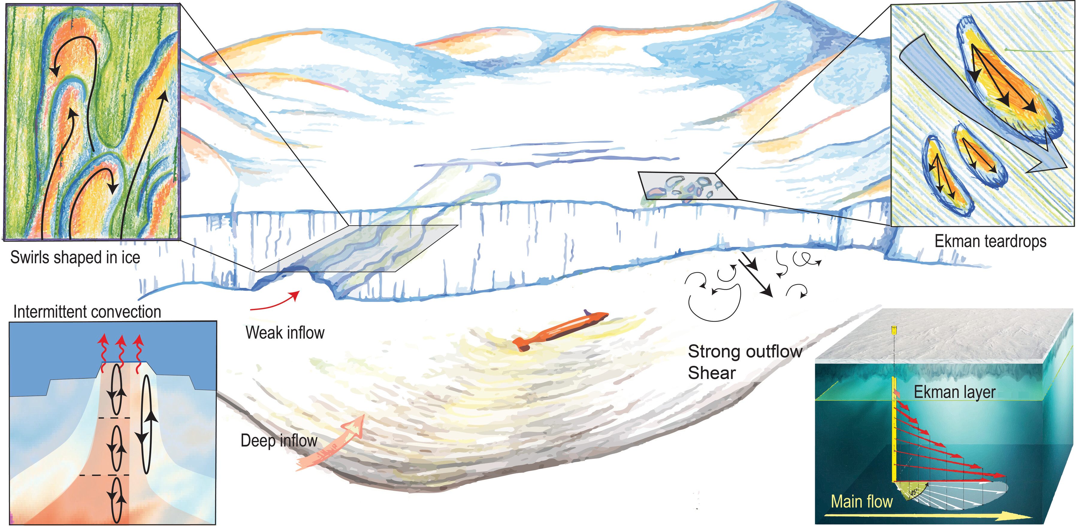 Авторы исследования выдвигают гипотезу: эти впадины формируются под действием так называемого «эффекта Экмана». В Южном полушарии сила Кориолиса отклоняет движущуюся воду влево. Если у ледяного основания возникает локальный источник тепла (например, трещина, через которую проникает тёплая вода), то таяние происходит несимметрично. Образуется форма, напоминающая каплю, ориентированную под углом к основному потоку. Такое объяснение — признание того, что под ледником существует сложная, нелинейная гидродинамика, которую наука только начинает понимать.